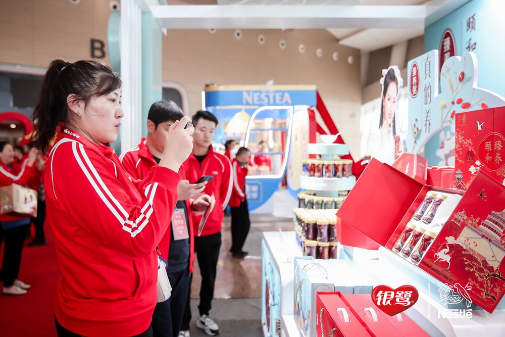 大會(huì)正式開始前,經(jīng)銷商們紛紛抵達(dá)現(xiàn)場(chǎng)。不同于往年,眾多新穎時(shí)尚的產(chǎn)品堆頭陳列:與頤和園IP合作的臻養(yǎng)粥古風(fēng)禮盒,雀巢咖啡世界咖啡系列等等新品,吸引經(jīng)銷商們和業(yè)務(wù)團(tuán)隊(duì)競(jìng)相拍照、品嘗產(chǎn)品,現(xiàn)場(chǎng)氛圍火爆。本次大會(huì)最引人注目的是火紅色經(jīng)銷商服上的“贏”字,展現(xiàn)了此次大會(huì)的信心與決心。
